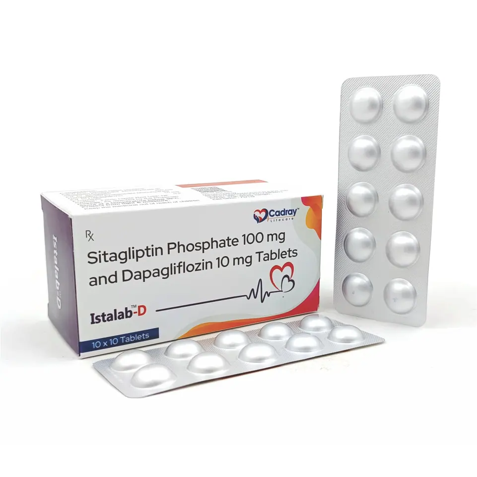 Istalab D Tablet is a potent combination medication that includes Sitagliptin Phosphate I.P. at a dosage of 100 mg and Dapagliflozin Propanediol U.S.P. at 10 mg. This innovative formulation is specifically designed for the management of type 2 diabetes mellitus in adults. Sitagliptin, a DPP-4 inhibitor, enhances the body’s ability to regulate blood sugar levels by increasing insulin secretion in response to meals and decreasing glucagon levels, which helps to lower glucose production in the liver. Dapagliflozin, a sodium-glucose co-transporter 2 (SGLT2) inhibitor, works by preventing the reabsorption of glucose in the kidneys, leading to increased glucose excretion through urine. This dual mechanism of action not only helps in achieving better glycemic control but also offers additional benefits such as weight loss and a reduction in blood pressure.