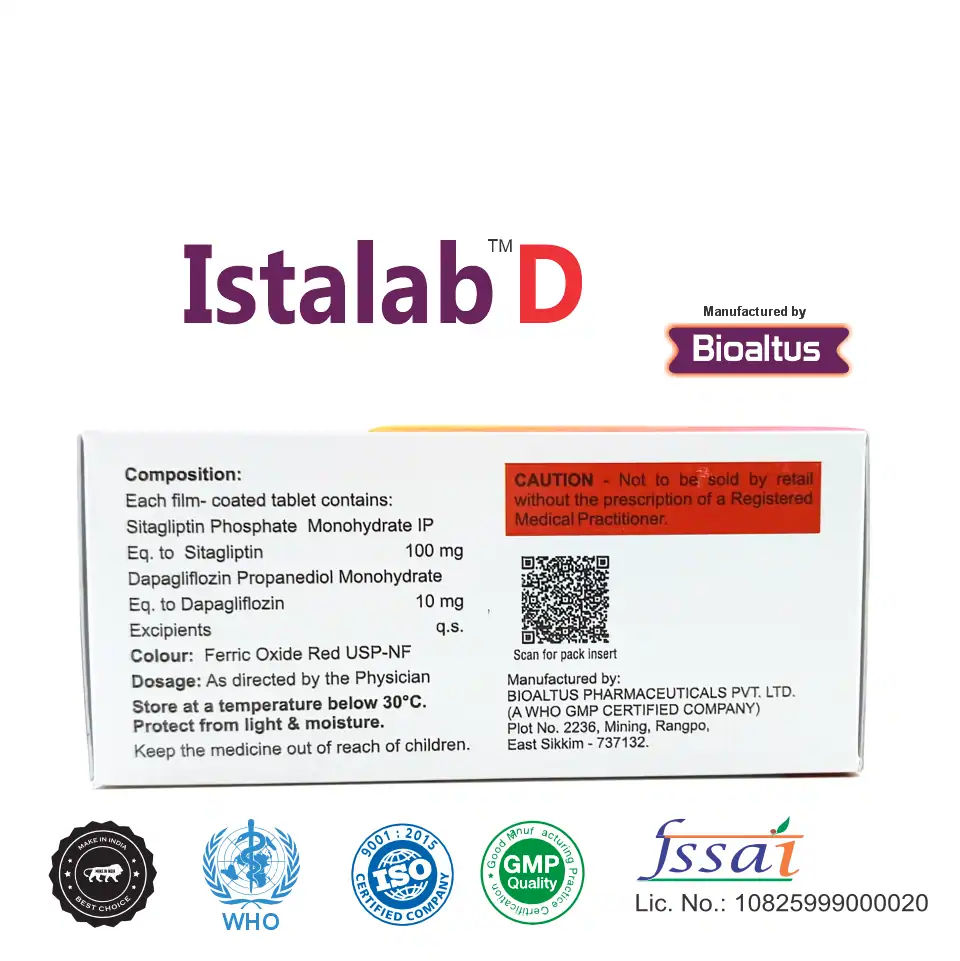 While Istalab D Tablet is generally well-tolerated, some patients may experience side effects. Common adverse reactions include urinary tract infections, genital mycotic infections, gastrointestinal disturbances such as nausea, and headache. Rare but serious side effects may include dehydration, kidney problems, and pancreatitis. Patients should be vigilant for symptoms such as excessive thirst, frequent urination, or abdominal pain and should seek medical attention if these arise.