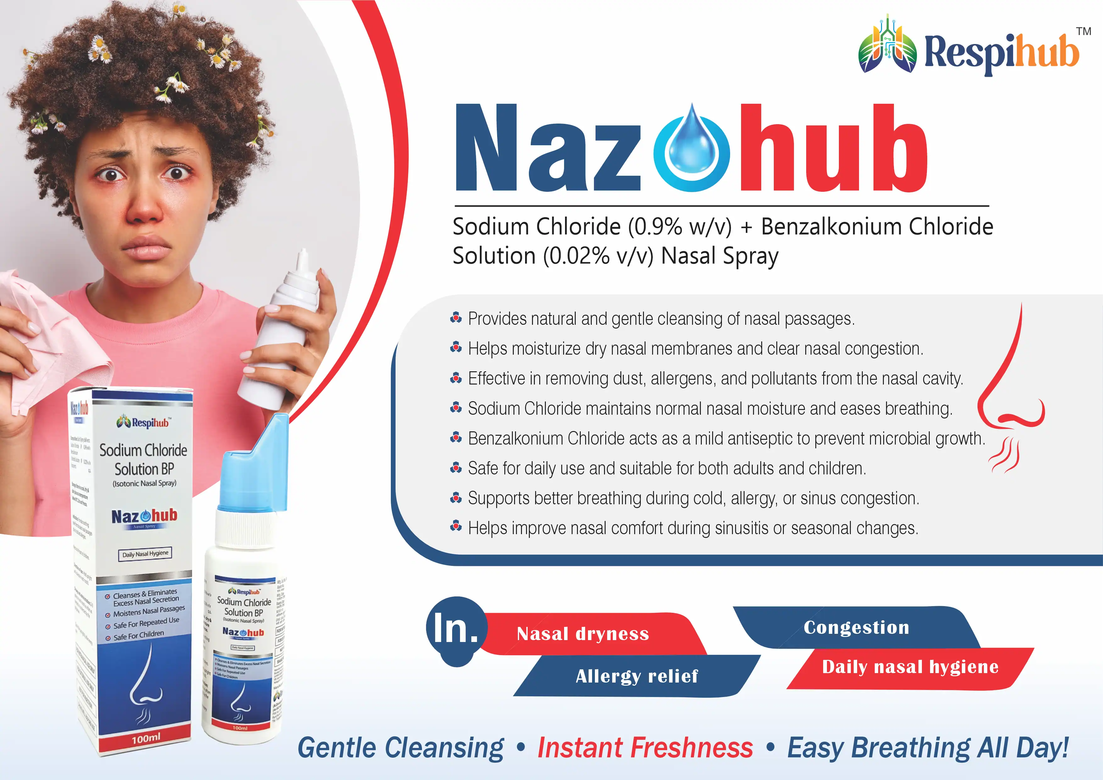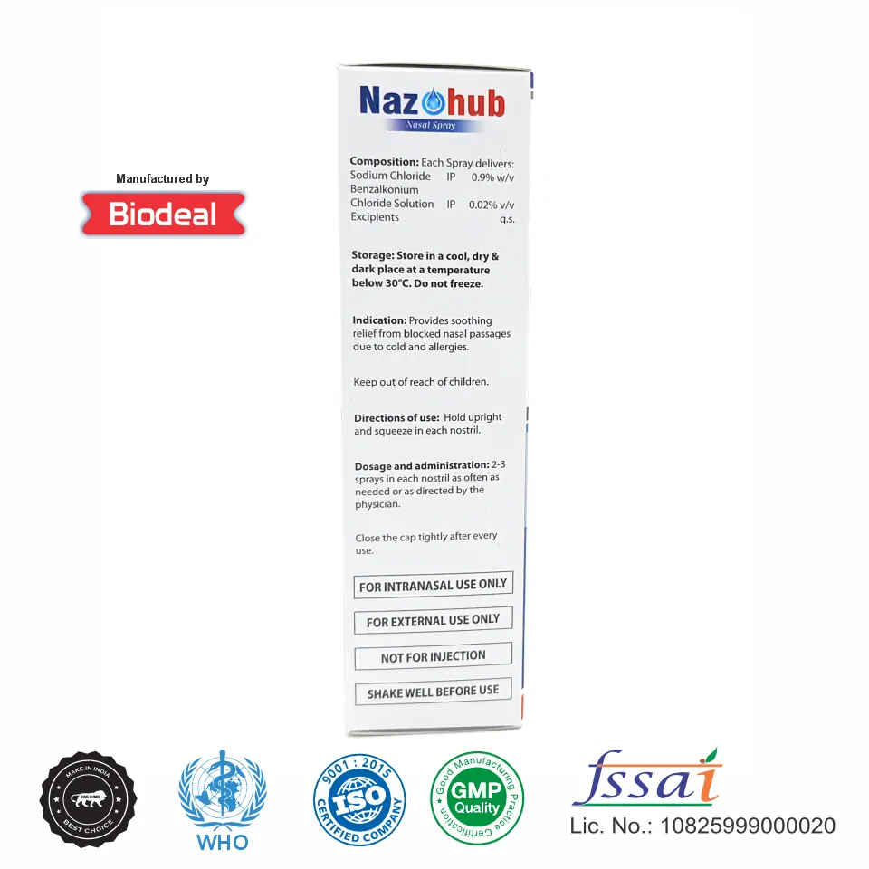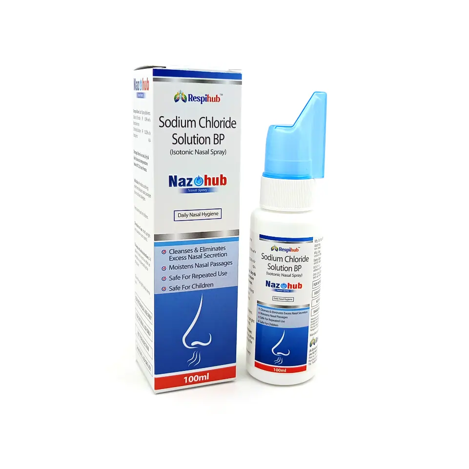 Nazohub Nasal Spray (Sodium Chloride 0.9% w/v + Benzalkonium Chloride Solution 0.02% v/v) is an isotonic saline nasal spray that helps moisturize dry nasal passages, relieve congestion, and cleanse nasal cavities. Sodium Chloride maintains optimal nasal moisture balance, while Benzalkonium Chloride ensures hygienic preservation and prevents microbial contamination.