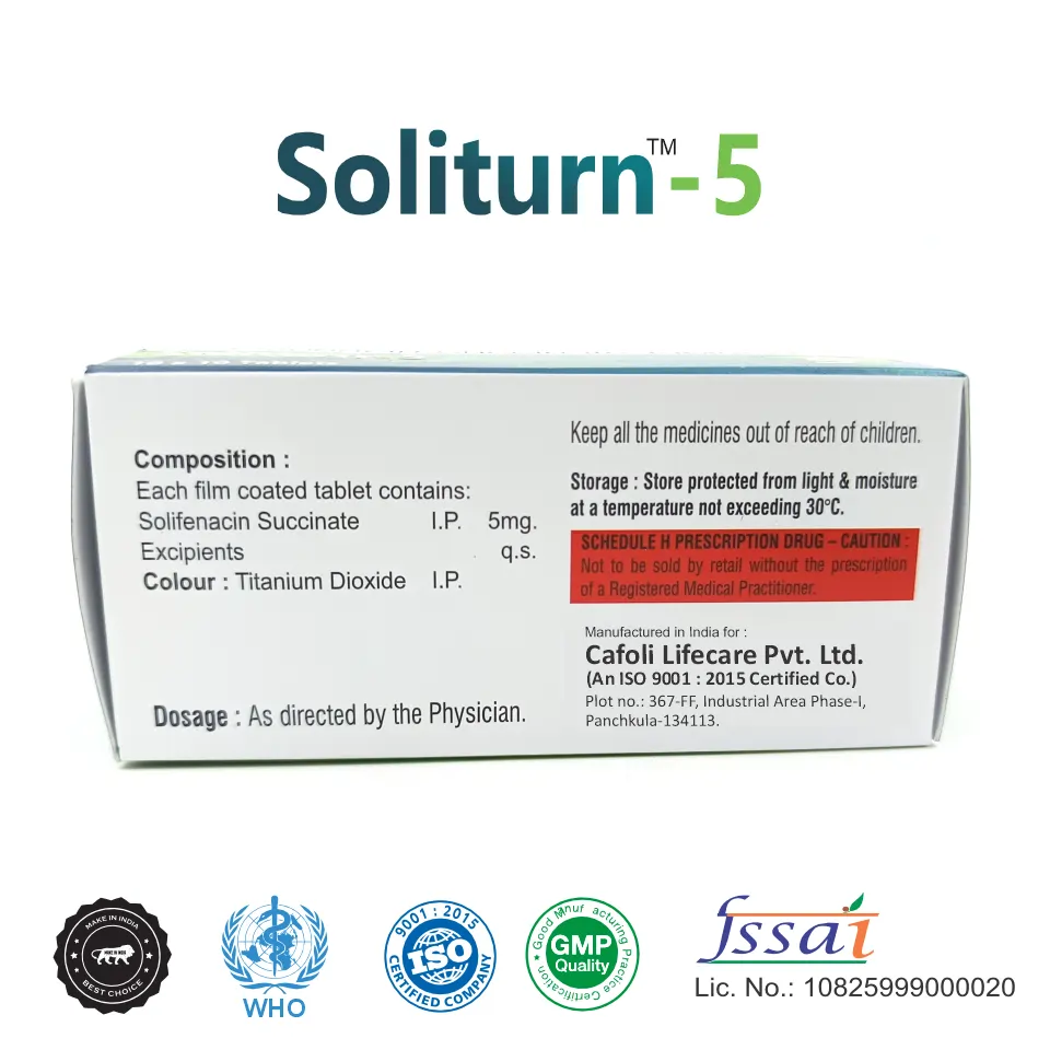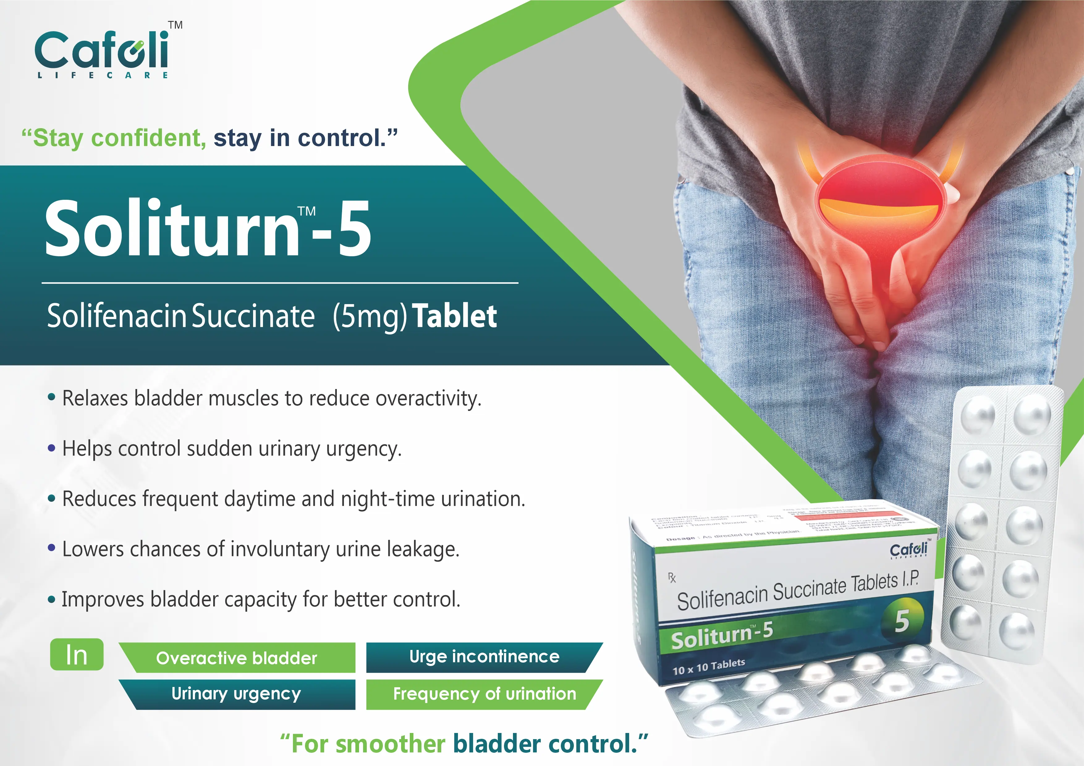 At Cafoli Lifecare, we understand that urology requires a higher standard of purity and efficacy. That is why Soliturn 5 is manufactured in world-class WHO-GMP certified facilities, ensuring that every tablet delivers consistent pharmacokinetic performance. For our PCD Pharma partners, Soliturn 5 offers a high-demand, monopoly-based molecule that strengthens any urology portfolio.