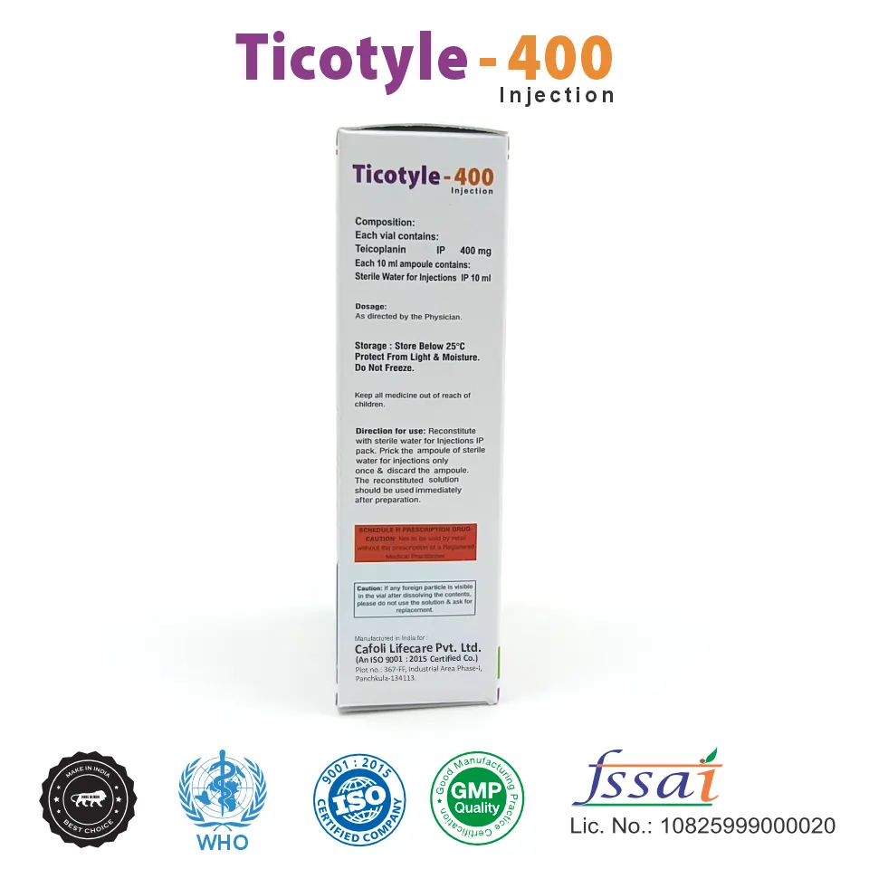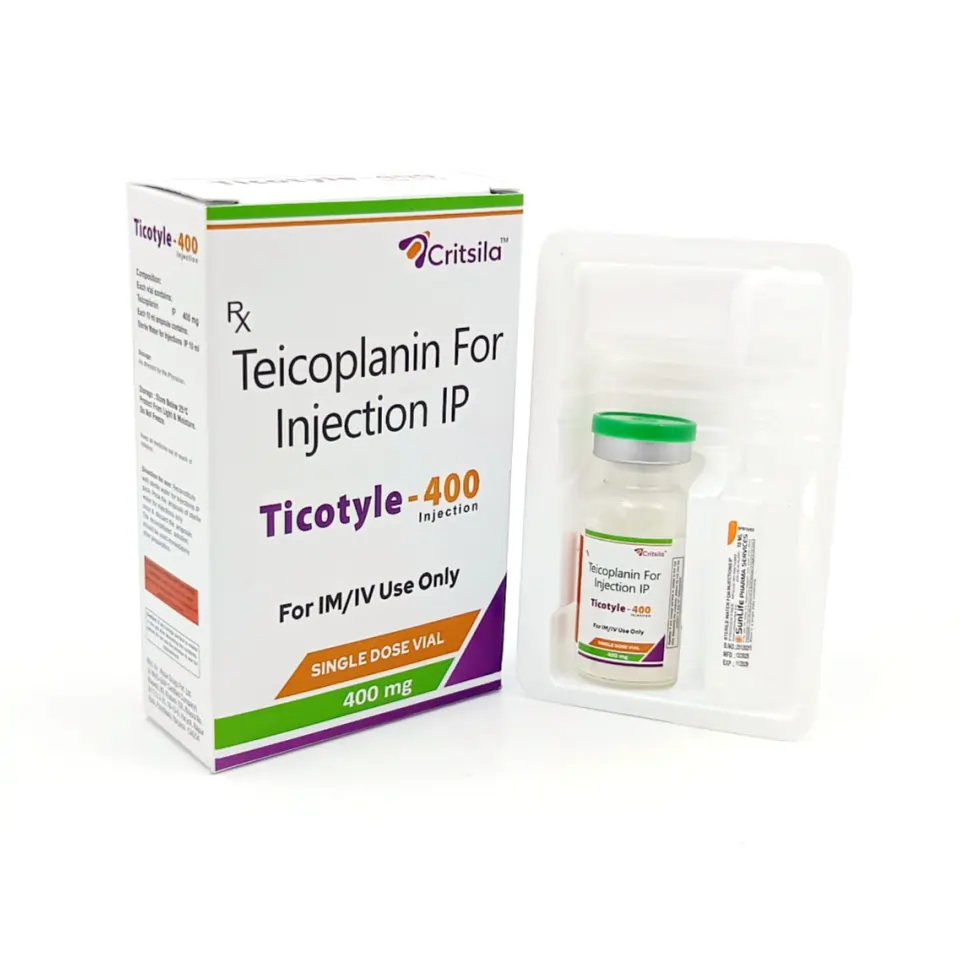 Ticotyle 400 Injection contains Teicoplanin (400mg), a glycopeptide antibiotic used primarily in the treatment of serious Gram-positive bacterial infections. It helps in treating infections caused by resistant organisms such as Staphylococcus aureus (including MRSA) and Enterococcus species. Ticotyle 400 is especially useful in managing infections where other antibiotics might fail, such as complicated skin infections, bone and joint infections, pneumonia, and septicemia.