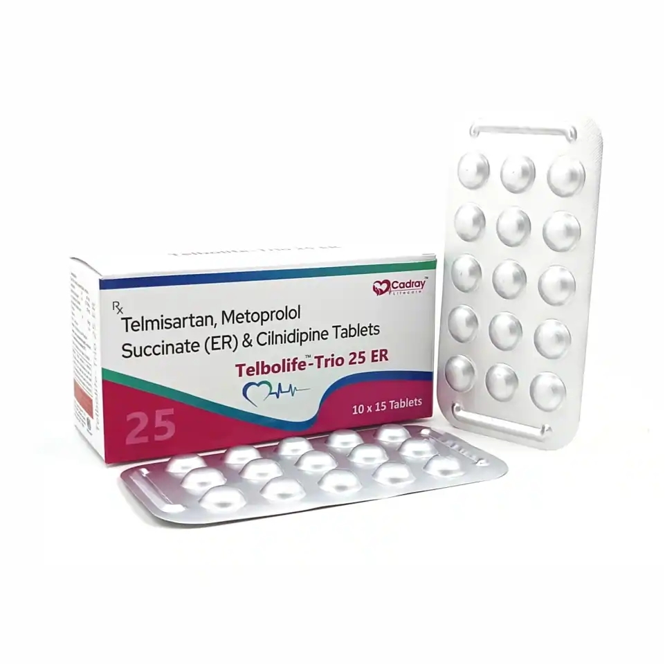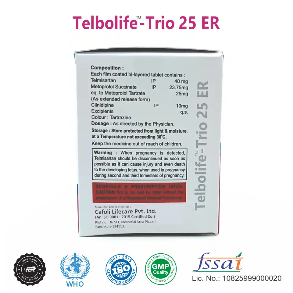 Telbolife Trio 25 Tablet is a fixed-dose combination used in the effective management of hypertension (high blood pressure) and cardiovascular risk reduction. It contains Telmisartan, an angiotensin II receptor blocker (ARB) that relaxes blood vessels; Cilnidipine, a calcium channel blocker that lowers blood pressure by preventing calcium influx in blood vessel walls; and Metoprolol Succinate, a cardio-selective beta-blocker that reduces heart rate and myocardial oxygen demand. This triple-drug combination offers synergistic control of blood pressure, improved arterial compliance, and protection against heart-related complications.