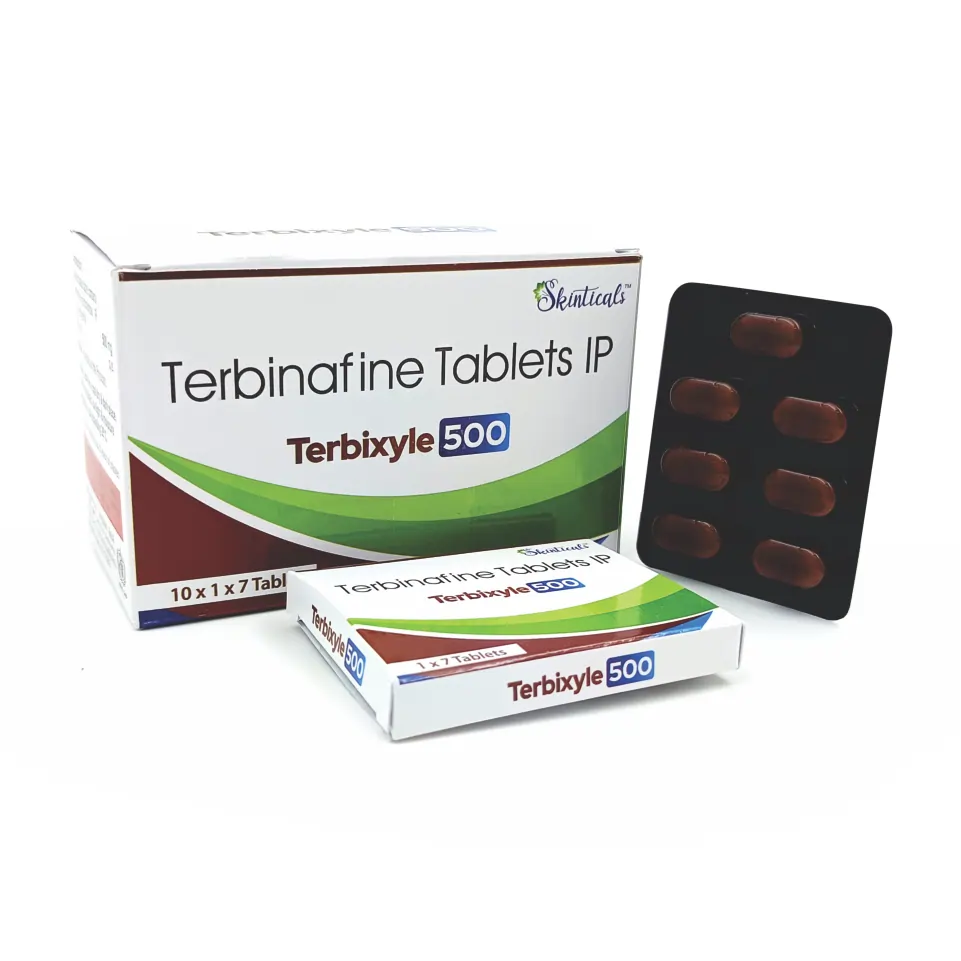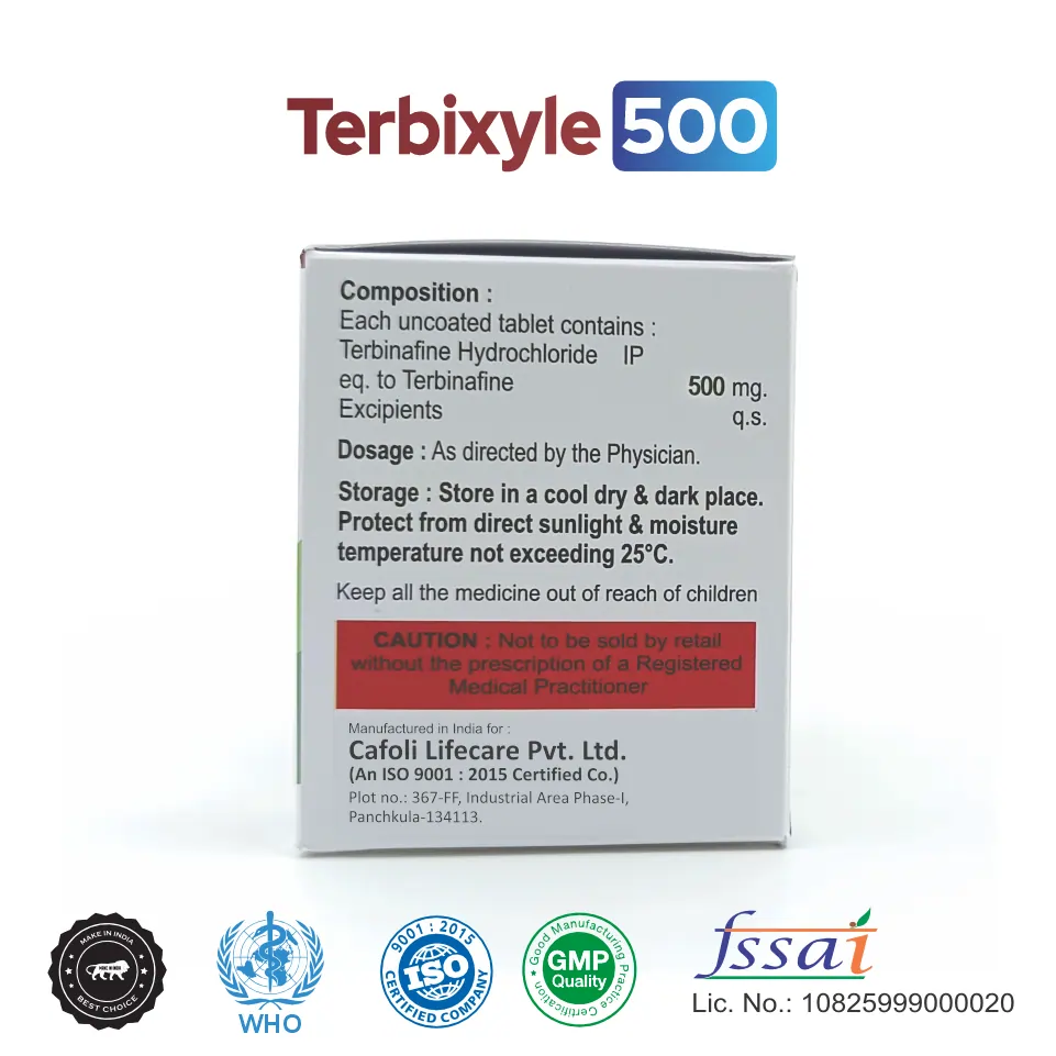 Terbixyle 500 Tablet contains Terbinafine (500mg), a high-strength antifungal medication used for the treatment of severe or resistant fungal infections. Terbinafine works by targeting the fungal cell membrane, inhibiting an essential enzyme, and effectively halting the growth and spread of fungi. This ensures a thorough and long-lasting cure for fungal infections.