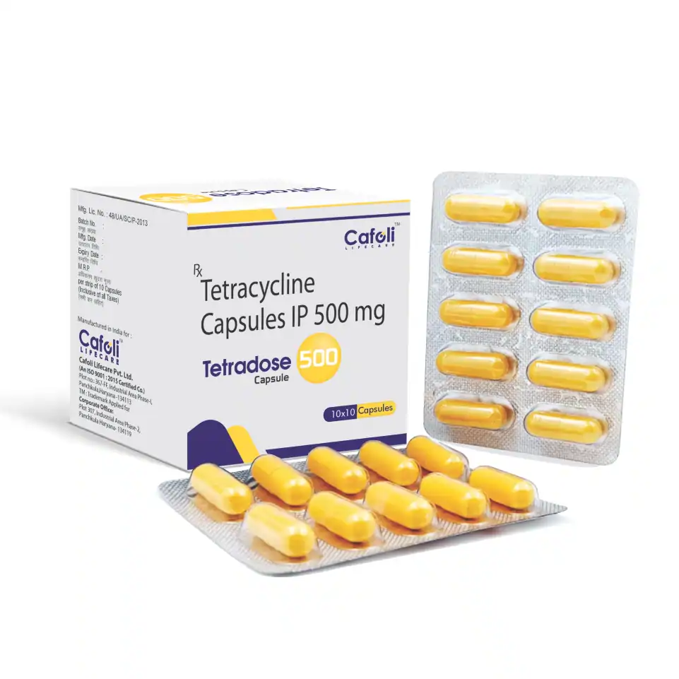 Tetradose 500 Capsule contains Tetracycline 500mg, a potent broad-spectrum antibiotic used for treating severe bacterial infections, including those of the respiratory tract, urinary tract, skin, and gastrointestinal system. It is effective in controlling bacterial growth and promoting faster recovery.