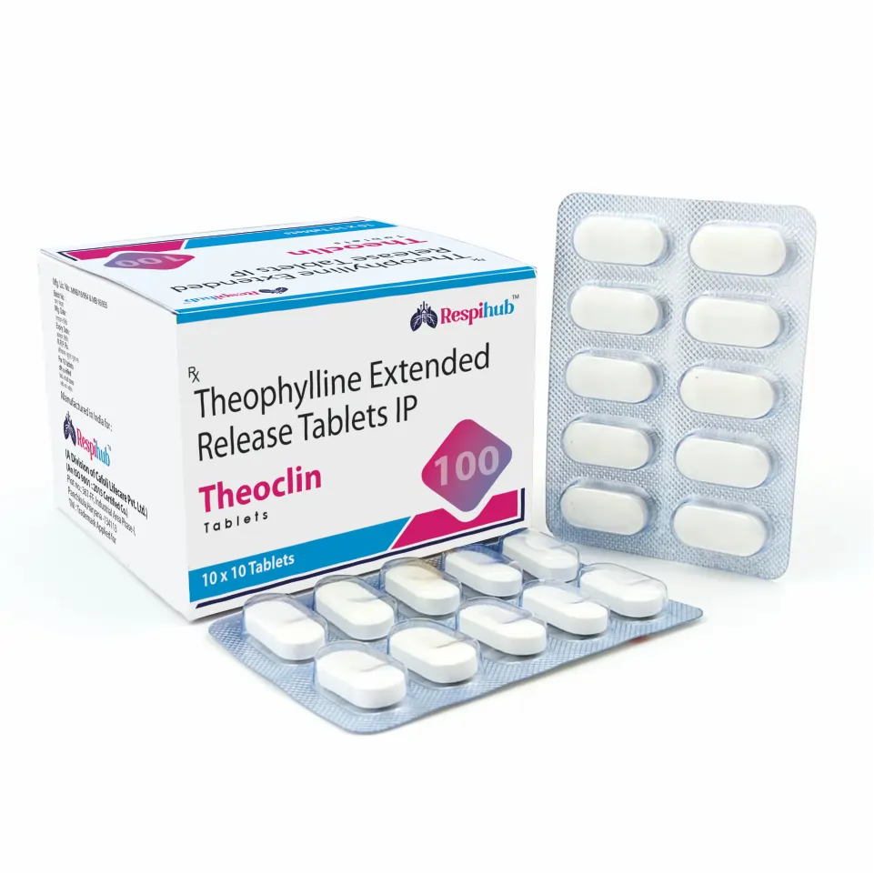 Theoclin 100 Tablet contains Theophylline 100mg, a bronchodilator used for the management of respiratory conditions such as asthma, chronic bronchitis, and chronic obstructive pulmonary disease (COPD). It helps in relaxing airway muscles, improving airflow, and reducing breathing difficulty.