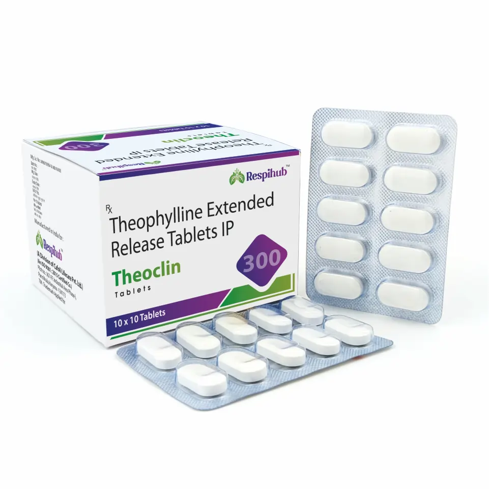 Clinically, Theoclin 300 Tablet is indicated for bronchial asthma, chronic obstructive pulmonary disease (COPD), chronic bronchitis, and emphysema. The tablet formulation ensures reliable dosing and sustained therapeutic effect, making it suitable for long-term respiratory management under medical supervision.