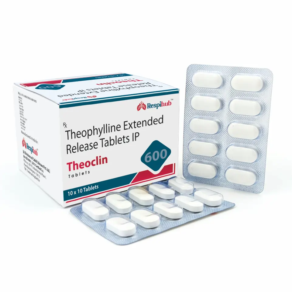 Theoclin 600 Tablet contains Theophylline 600mg, a well-known methylxanthine bronchodilator used in the management of chronic respiratory disorders. It helps in relaxing bronchial smooth muscles, thereby improving airflow and easing breathing difficulties in patients with obstructive airway diseases.