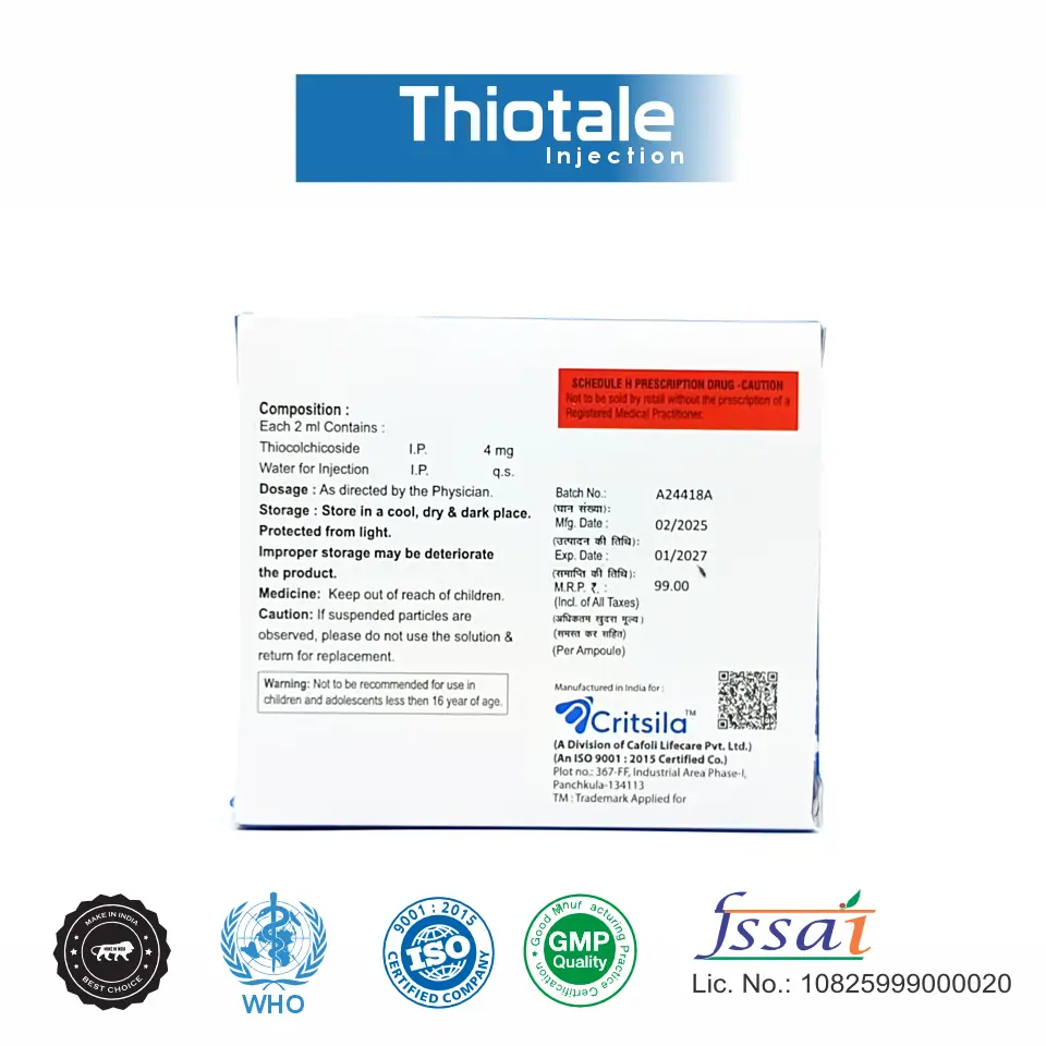 Thiotale Injection contains Thiocolchicoside (4mg), a muscle relaxant with anti-inflammatory properties. It is commonly used to relieve painful muscle spasms associated with musculoskeletal disorders. Thiocolchicoside works by acting on the central nervous system to relax muscles, reduce stiffness, and ease movement without causing significant sedation.