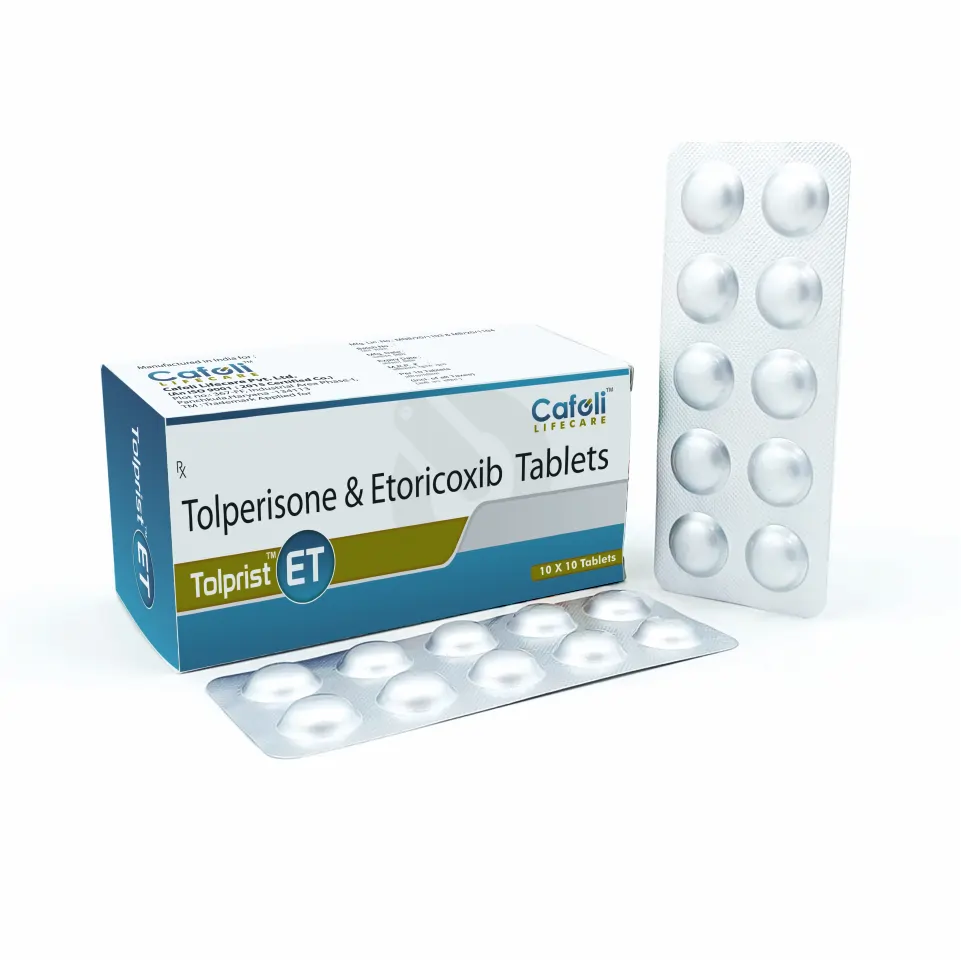 Tolprist ET Tablet, with its powerful combination of Tolperisone (150mg) and Etoricoxib (90mg), represents a cutting-edge solution for the comprehensive management of musculoskeletal pain and associated muscle spasms. Tolperisone acts as a centrally acting muscle relaxant, effectively reducing muscle stiffness and improving mobility without causing sedation. Etoricoxib, a potent selective COX-2 inhibitor, provides powerful anti-inflammatory and analgesic effects. This synergistic formulation offers dual-action relief, addressing both the source of the pain and the involuntary muscle contractions, making it an essential prescription for conditions like acute lower back pain, cervical spondylitis, and post-operative discomfort.