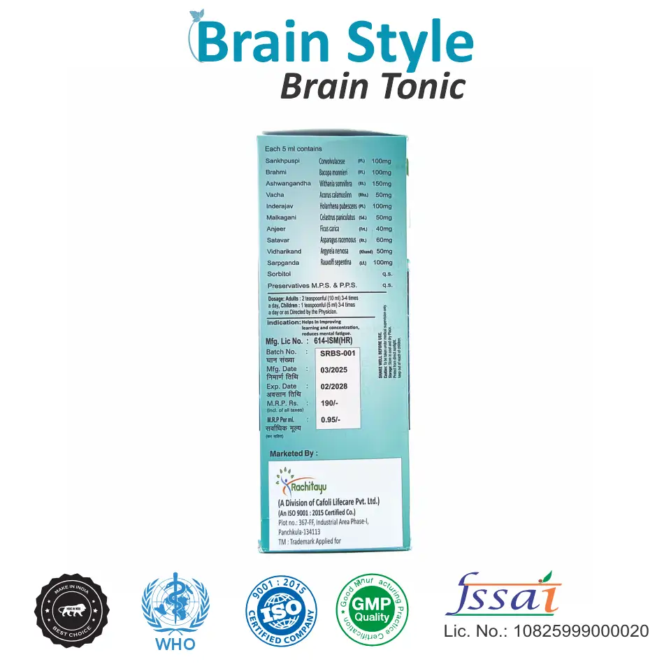 Brain Style Syrup is a powerful herbal formulation that combines the therapeutic benefits of well-known Ayurvedic herbs to support brain function and overall cognitive health. This tonic is designed to enhance memory, concentration, and mental clarity. The ingredients such as Tonic Fobrahmi and Shankhpushpi are traditionally used to promote brain health, reduce stress, and improve learning capacity.