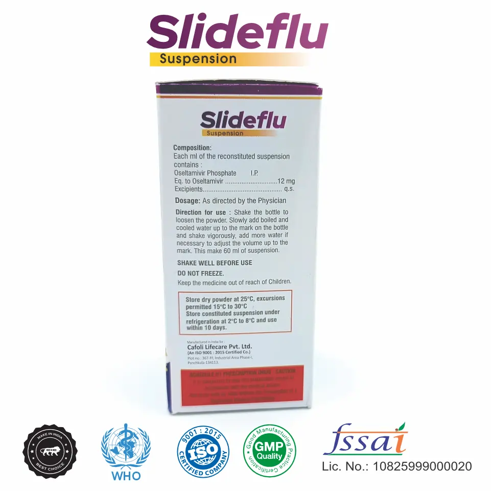 Slideflu Suspension contains Oseltamivir Phosphate 12mg, a clinically proven anti-viral agent for the treatment and prevention of influenza (flu). The syrup form makes it suitable for pediatric and adult patients, ensuring accurate dosing and compliance.