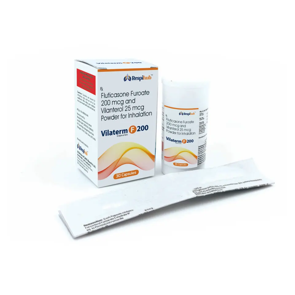 Vilaterm Inhaler is an advanced and highly effective combination medication that provides powerful, dual-action therapy for the long-term management of chronic respiratory diseases. It contains a precise dose of Vilanterol (25 mcg), a long-acting beta-2 agonist (LABA), and Fluticasone Furoate (200 mcg), a potent inhaled corticosteroid (ICS). This strategic ICS-LABA combination works synergistically to address both the underlying inflammation in the airways and the immediate bronchospasm, offering a level of control and symptom prevention that is superior to monotherapy. It is an essential component of daily maintenance therapy for patients with moderate to severe asthma and COPD.