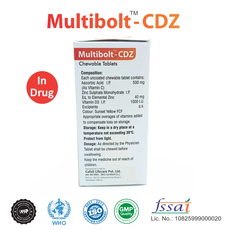 Multibolt CDZ Tablet is a specially formulated chewable tablet designed to strengthen immunity and support overall health. This potent combination of Vitamin C, Vitamin D, and Zinc offers comprehensive benefits for boosting the immune system, enhancing bone health, and promoting cellular repair.